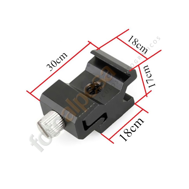 Zapata ajustable con rosca de ¼” disponible en su base, podemos acoplarla directamente a un trípode o a una rótula que disponga de este tipo de tornillo para montar diversos accesorios fotográficos, como flash de mano, micrófono, disparadores, etc…
