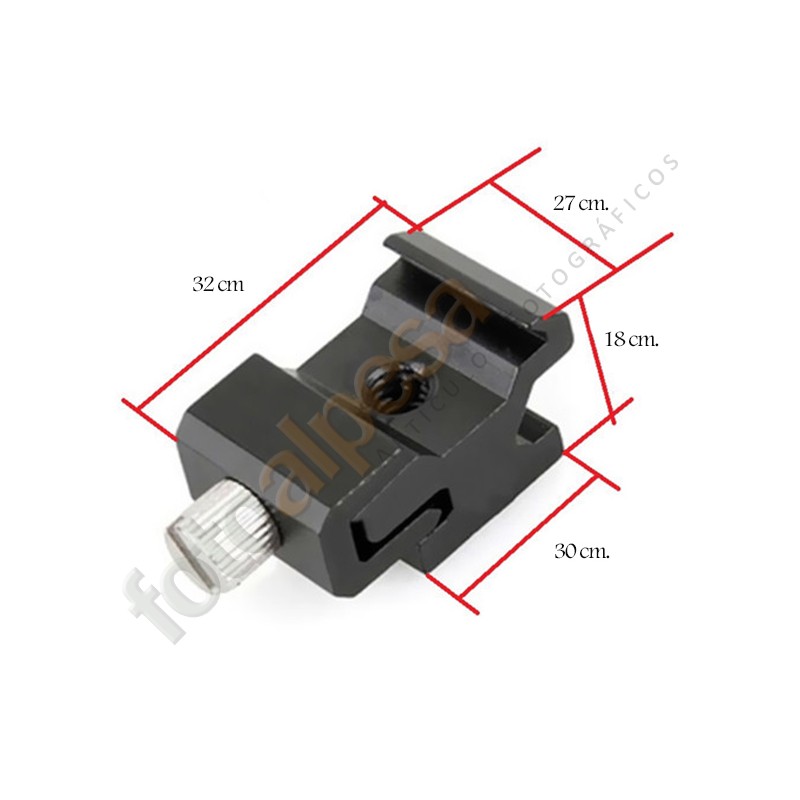 Zapata ajustable con rosca de ¼” disponible en su base, podemos acoplarla directamente a un trípode o a una rótula que disponga de este tipo de tornillo para montar diversos accesorios fotográficos, como flash de mano, micrófono, disparadores, etc…