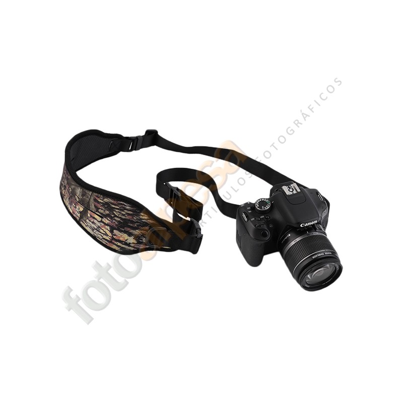 Correa de gran calidad, construida en neopreno con estampado de camuflaje para evitar roces en el cuello y amortiguar el peso de la cámara.