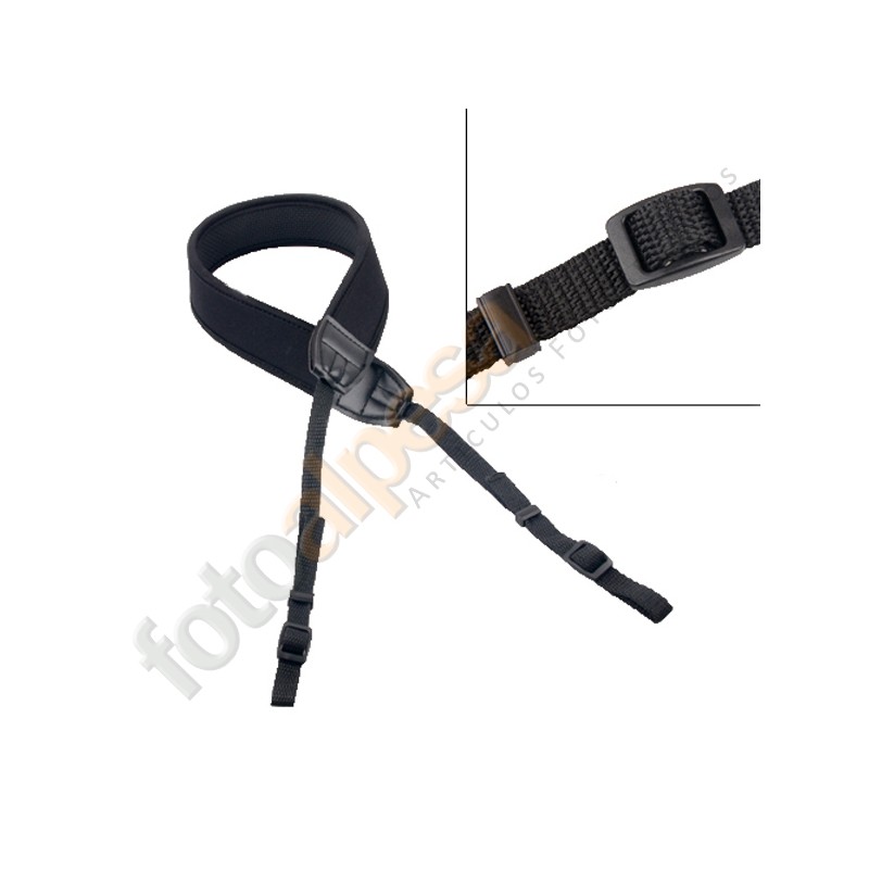 Correa de gran calidad, construida en neopreno para evitar roces en el cuello y amortiguar el peso de la cámara.
