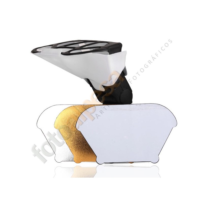 - Incorpora 3 fondos reflectores acoplables mediante velcro: Plateado, dorado y blanco, para dar suavizar las sombras, y dar tonalidades de color al flash.