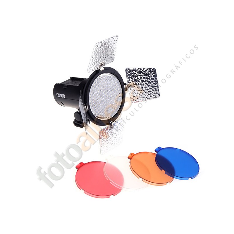 Yn 168 Led formado por 168 LEDs de alta calidad. Se adapta la cantidad de luz emitida a través del dial. Posee 3 tipos de modo de fuente de alimentación: fuente de alimentación de CC (opcional), batería de litio Tipo Sony NP-F (opcional), 6*batería AA (opcional).