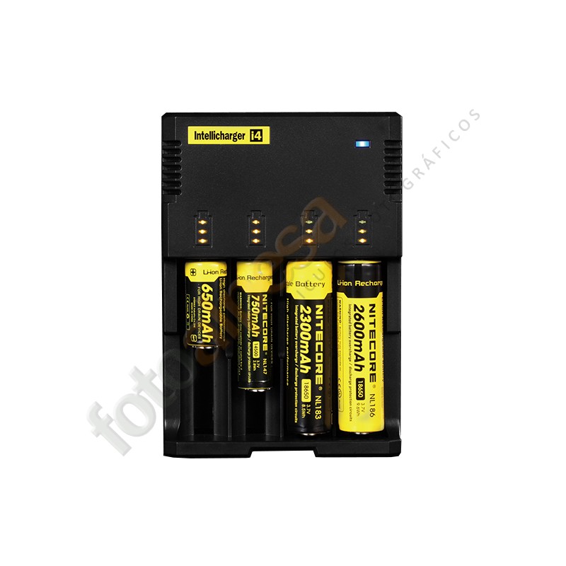 El Intellicharger i4 es cargador de pilas universal, automático, inteligente y compatible con casi todos los tipos de baterías recargables, eliminando así la necesidad de poseer varios cargadores. 26650, 18650, 22650, 17670, 18490, 17500, 17335,16340 (RCR123), 14500, 10440 , AA, AAA, C