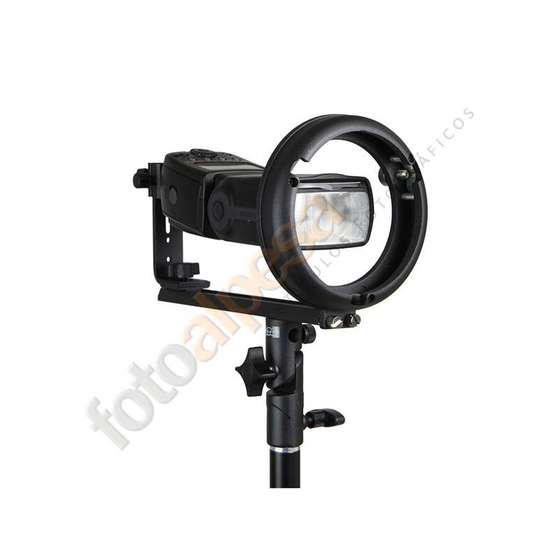 Una rotula muy flexible que te permite utilizar un flash de zapata portátil con accesorios de montura tipo Bowens.